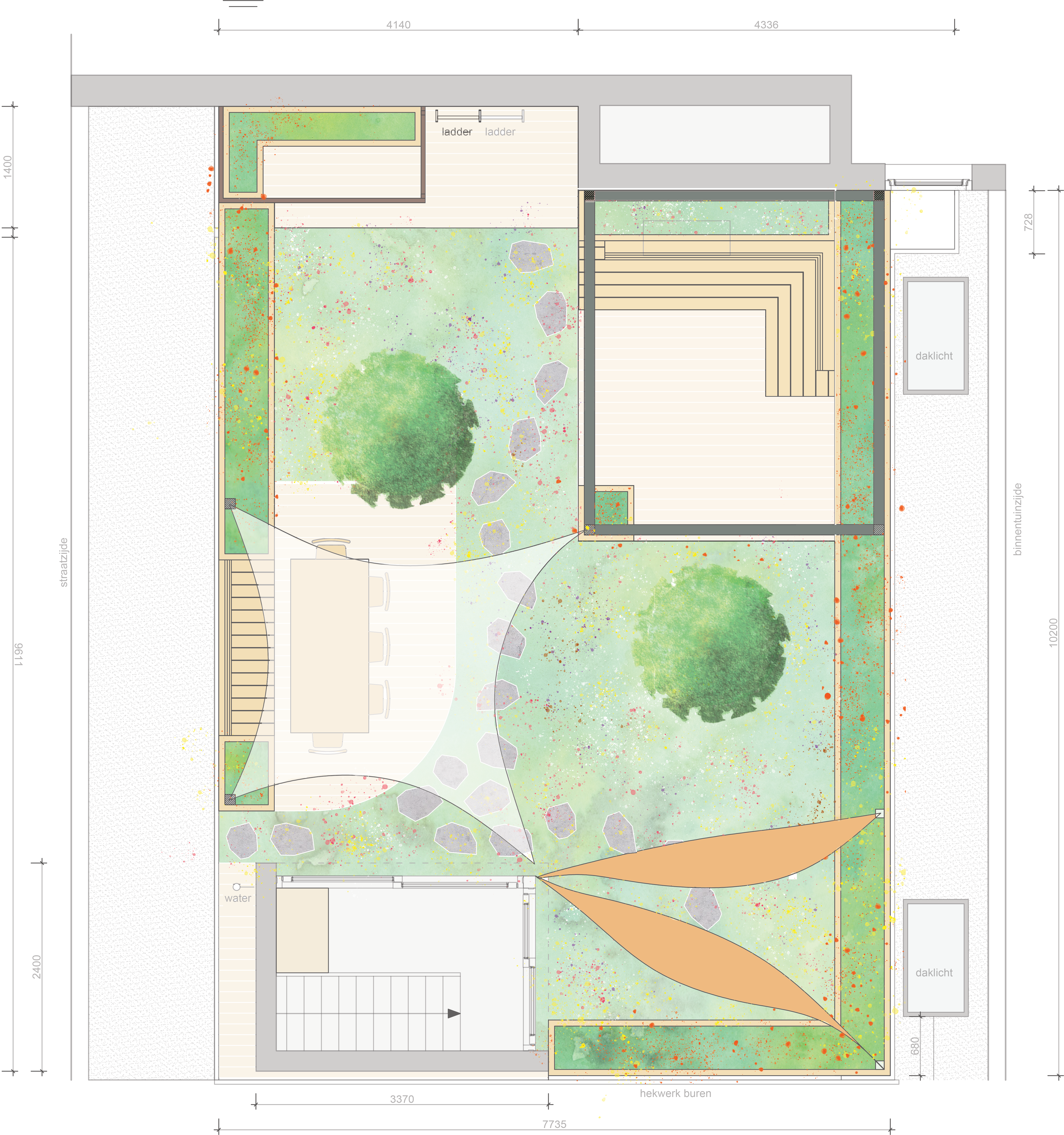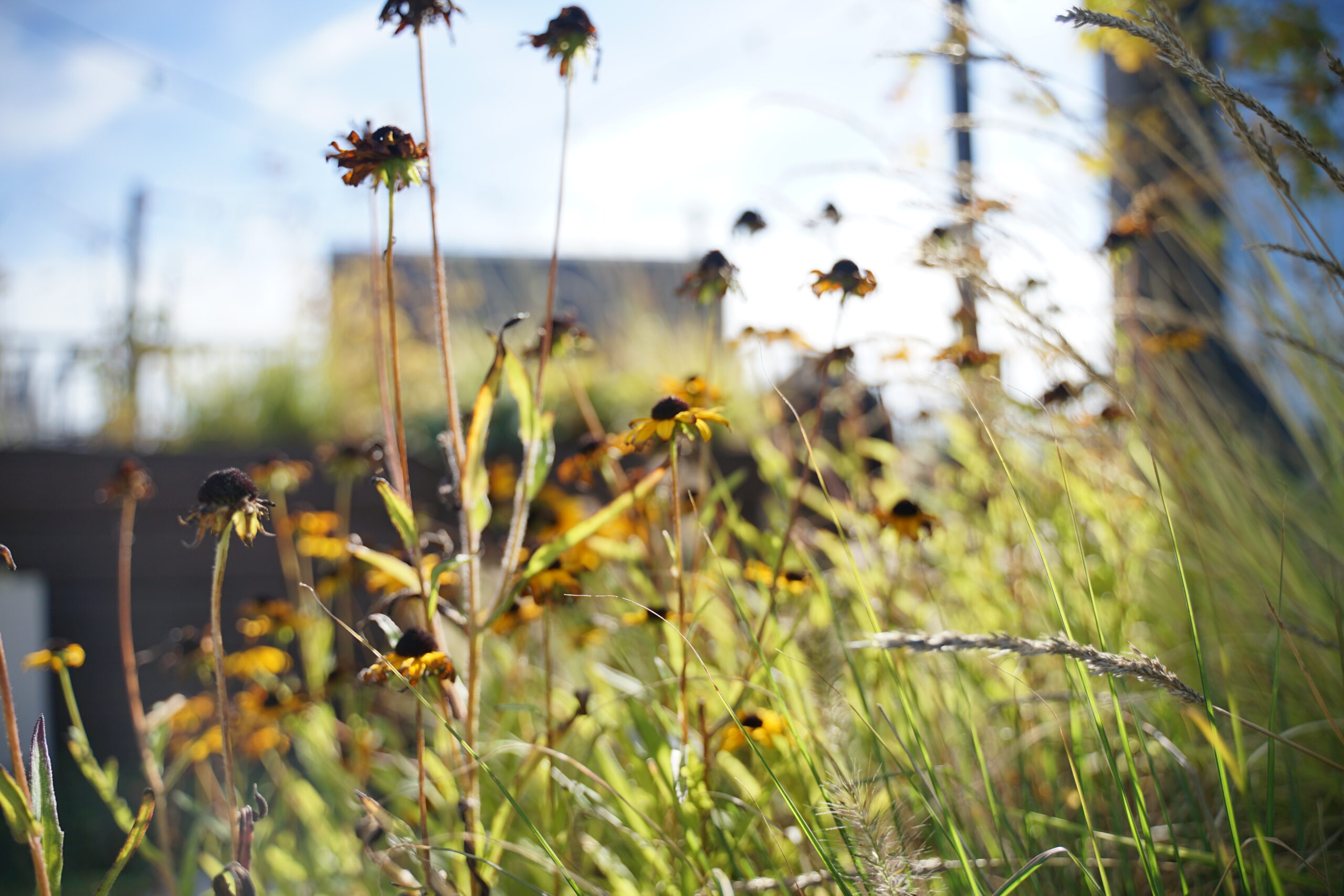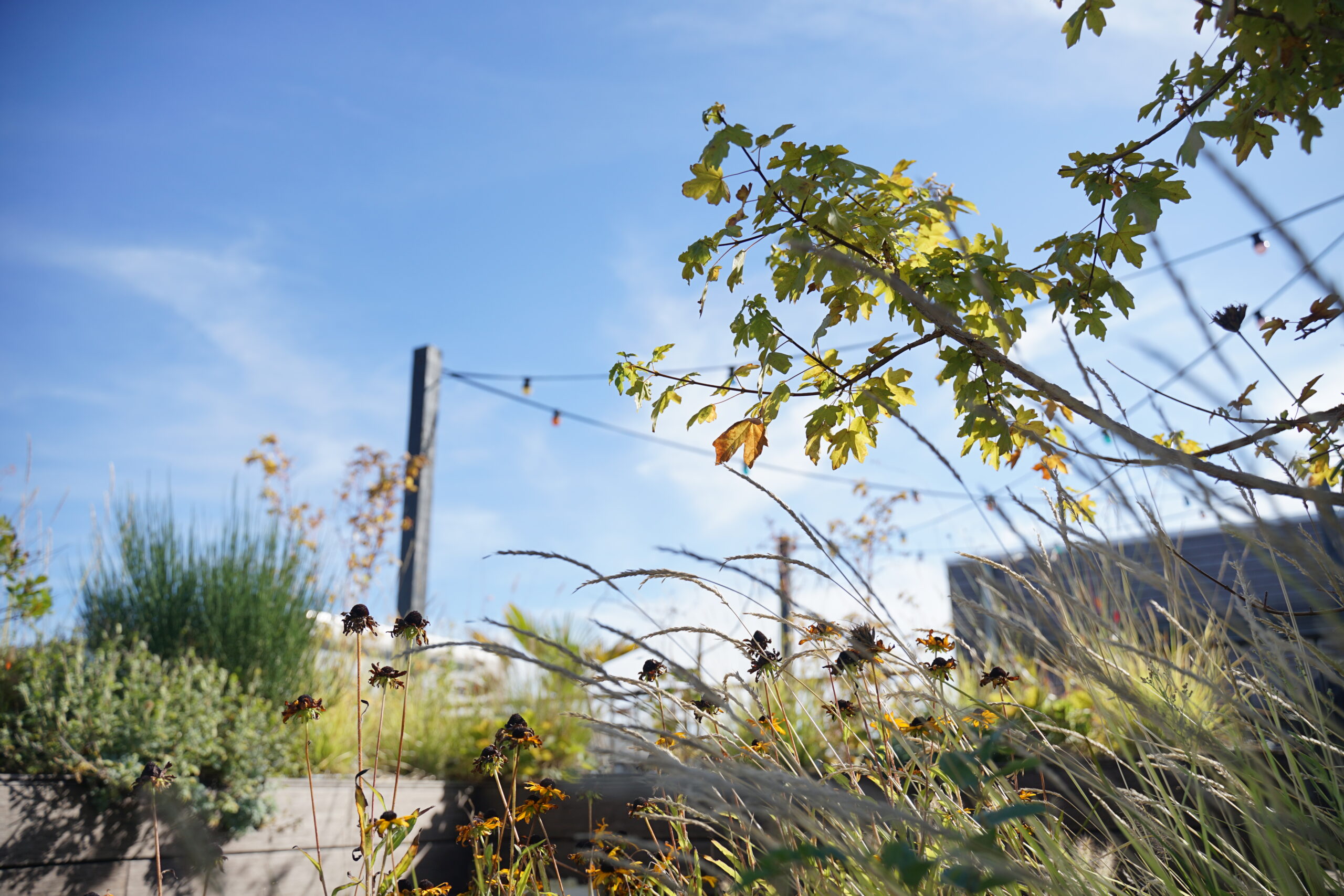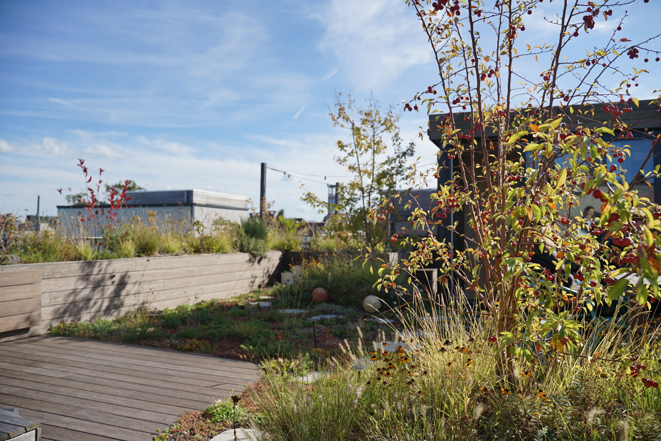 Private rooftop garden with terrace, plants and a small green house. Underneath is a light-weight drainage layer for rain water run-off.